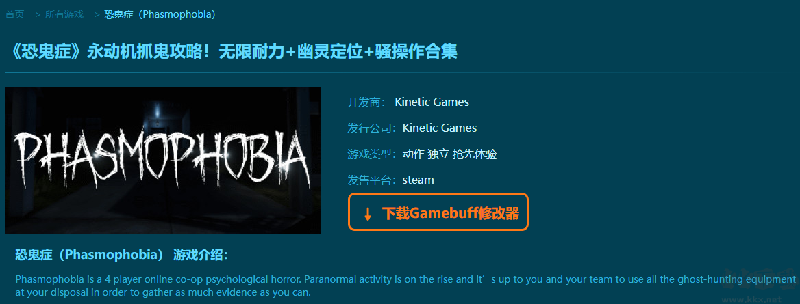 恐鬼症(Phasmophobia)二十一项修改器pc完整版是一款功能强大的游戏辅助工具,可在三项修改模式中选择开启。支持玩家在游戏中一键开启,无限体力、超级跑动速度、金钱、经验倍率、理智流失速度倍率、无限盐、幽灵始终可见等多项修改功能。需要的小伙伴快来KK下载站下载这款修改器体验一下吧。