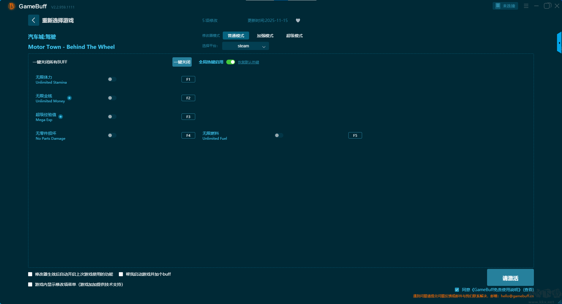 汽车城驾驶五项修改器pc官网版是一款拥有多项修改功能的游戏辅助工具。玩家可在三种修改模式中选择使用,可一键开启,无限体力、无限金钱、超级经验值、无零件损坏、无限燃料等五项修改功能,支持在steam平台使用。需要这款修改器的小伙伴快来KK下载站下载,开启你的无敌游戏之旅吧。