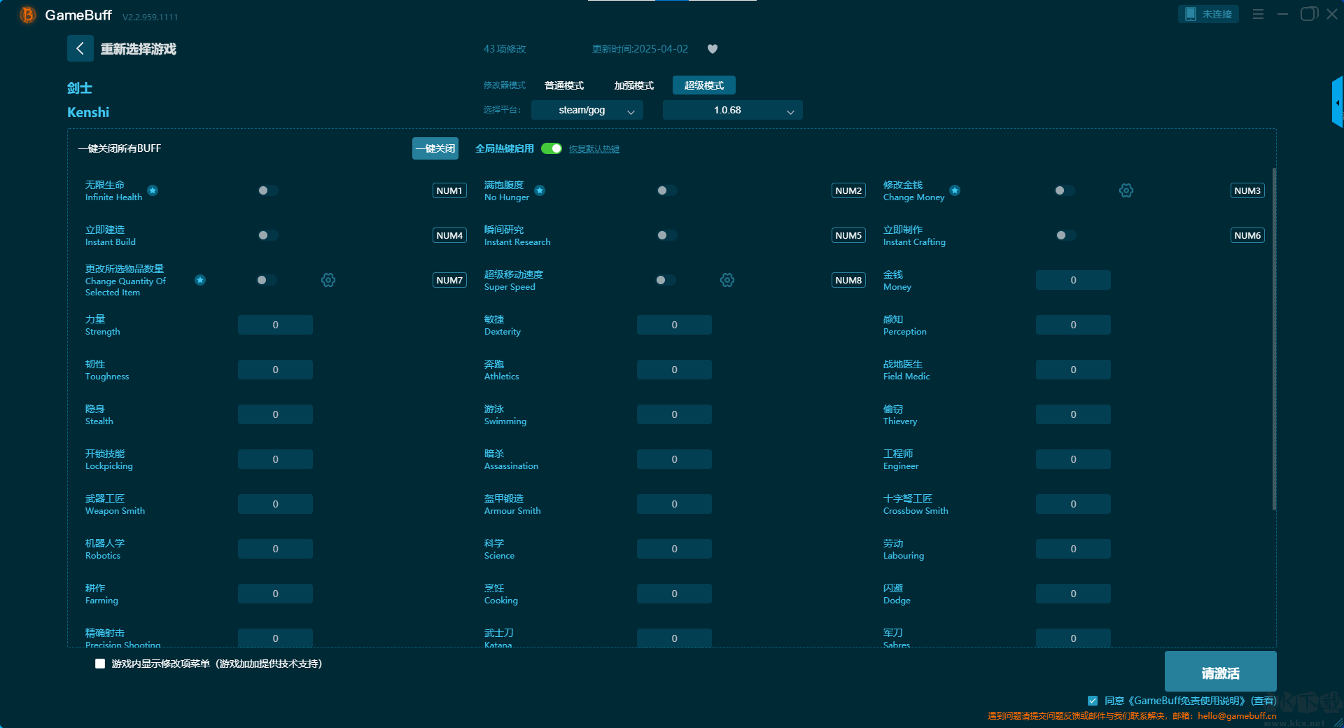 剑士(Kenshi)十一项修改器pc抢先版超级模式 (支持 43 项修改,不支持联网模式)