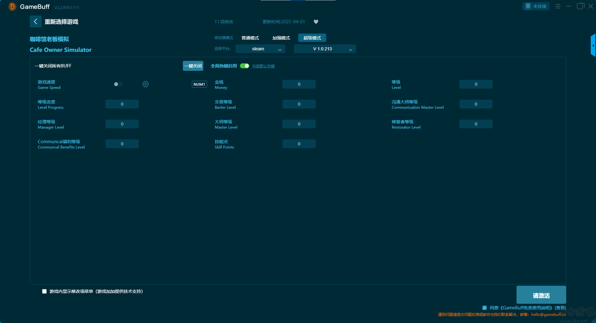 咖啡馆老板模拟二十五项修改器pc正版是一款功能强大的游戏辅助工具。支持在steam平台使用,玩家可在游戏的游玩过程中一键开启,游戏速度、等级进度、经理等级、Communcal 福利等级、金钱、交易等级、大师等级、技能点等多项修改功能。需要这款修改器的小伙伴可以来KK下载站下载体验。