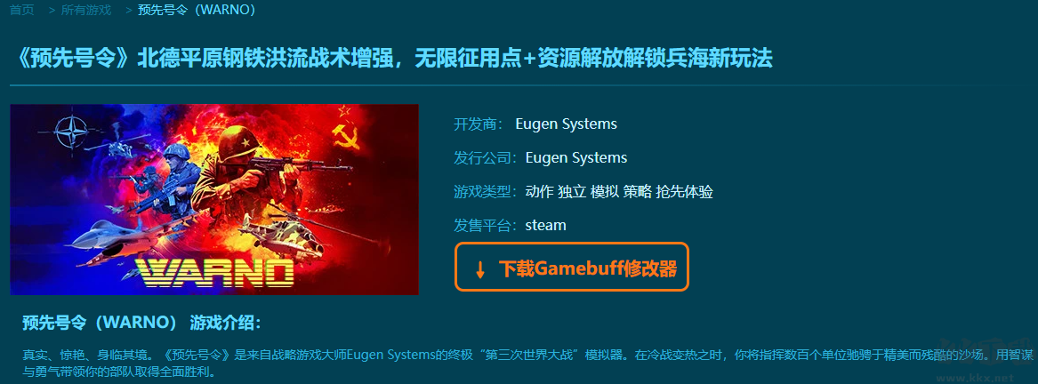 预先号令六项修改器pc正式版是一款拥有超多修改功能的游戏辅助修改器。多样的修改模式和修改功能,完美的助力你在游戏中大杀四方。拥有,无限命令、敌方无法指挥、无限单位、无限单位(陆军元帅与行动)、极速充能风之翼、重置敌方分数、暂停游戏计时器等多项修改功能。需要的小伙伴快来下载体验。