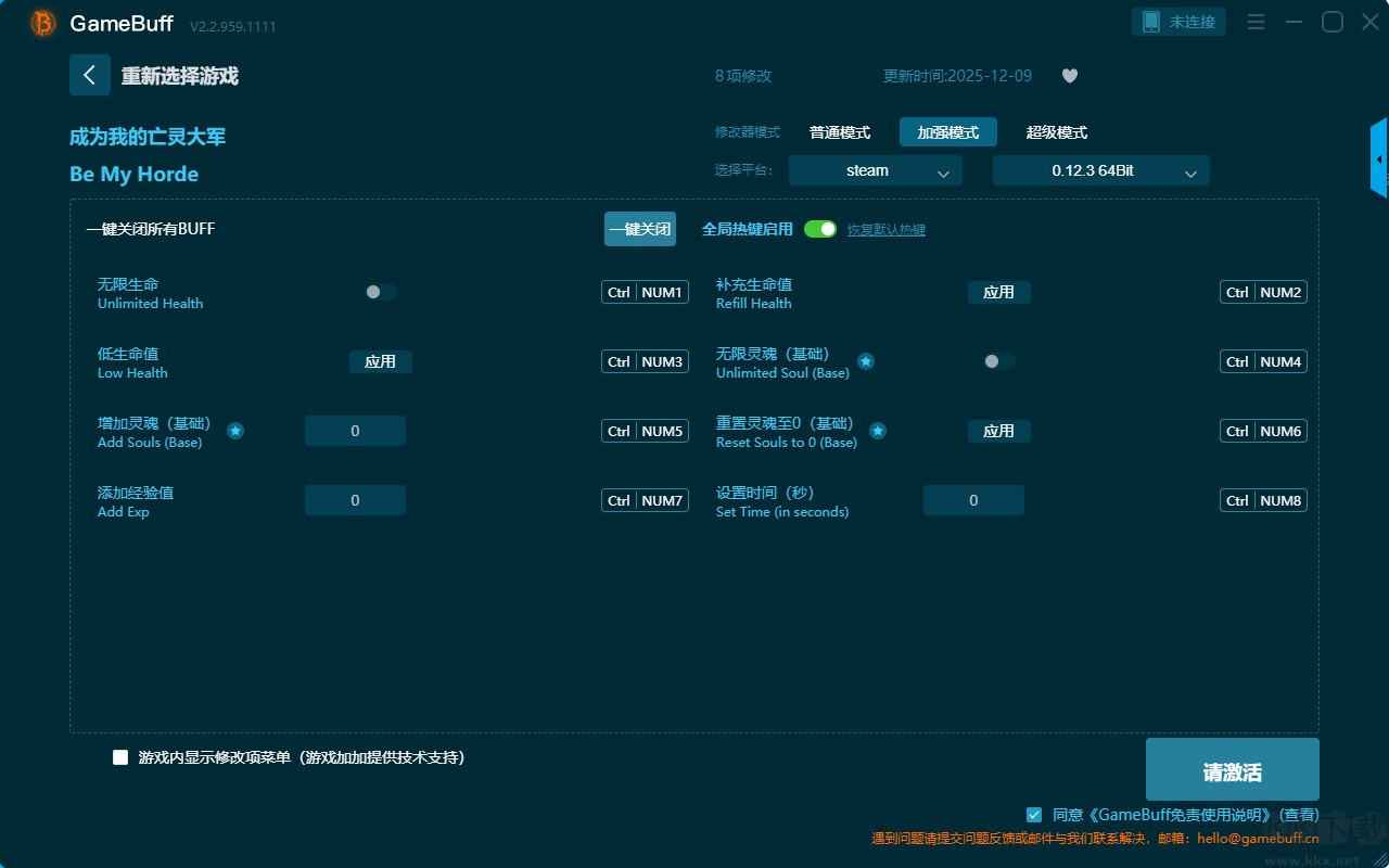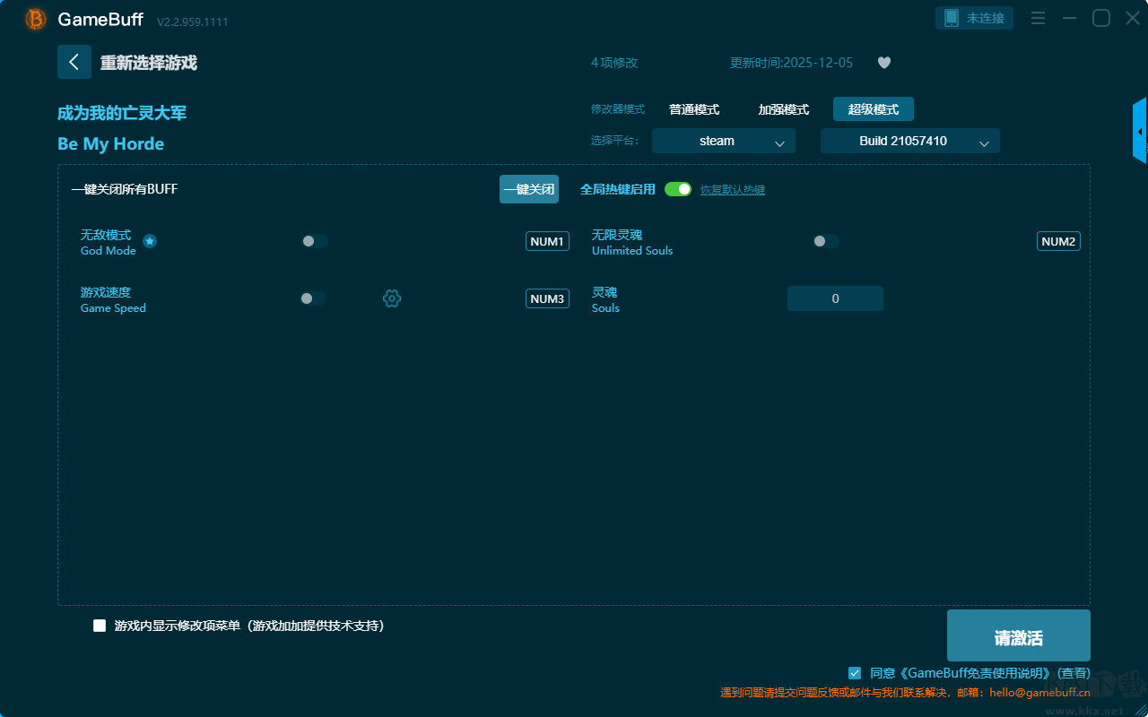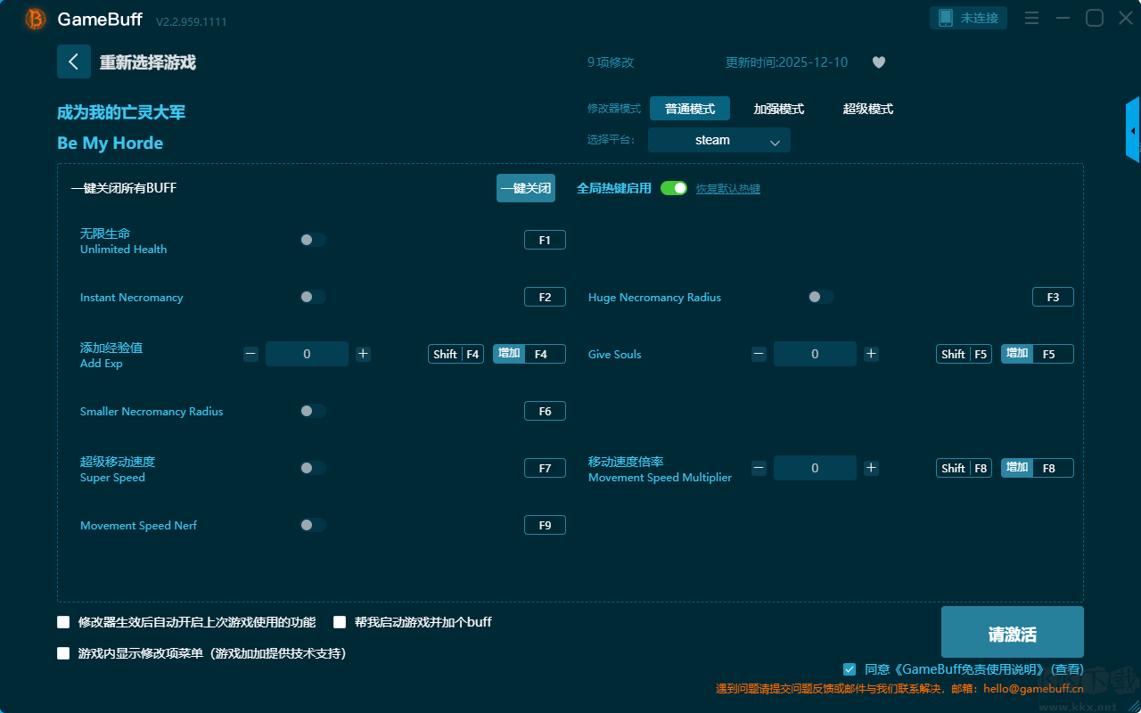 成为我的亡灵大军九项修改器pc完整版是一款功能强大的游戏辅助工具,可为超7000+的游戏开启辅助修改。玩家可在这款修改器中为游戏成为我的亡灵大军一键开启,无限生命、低生命值、增加灵魂(基础)、添加经验值、补充生命值、无限灵魂需要这款修改器的小伙伴快来KK下载站下载游戏游戏体验一下吧。