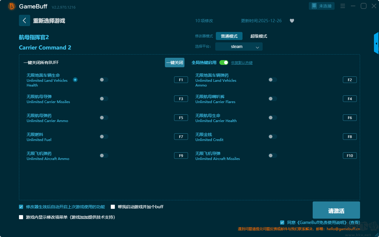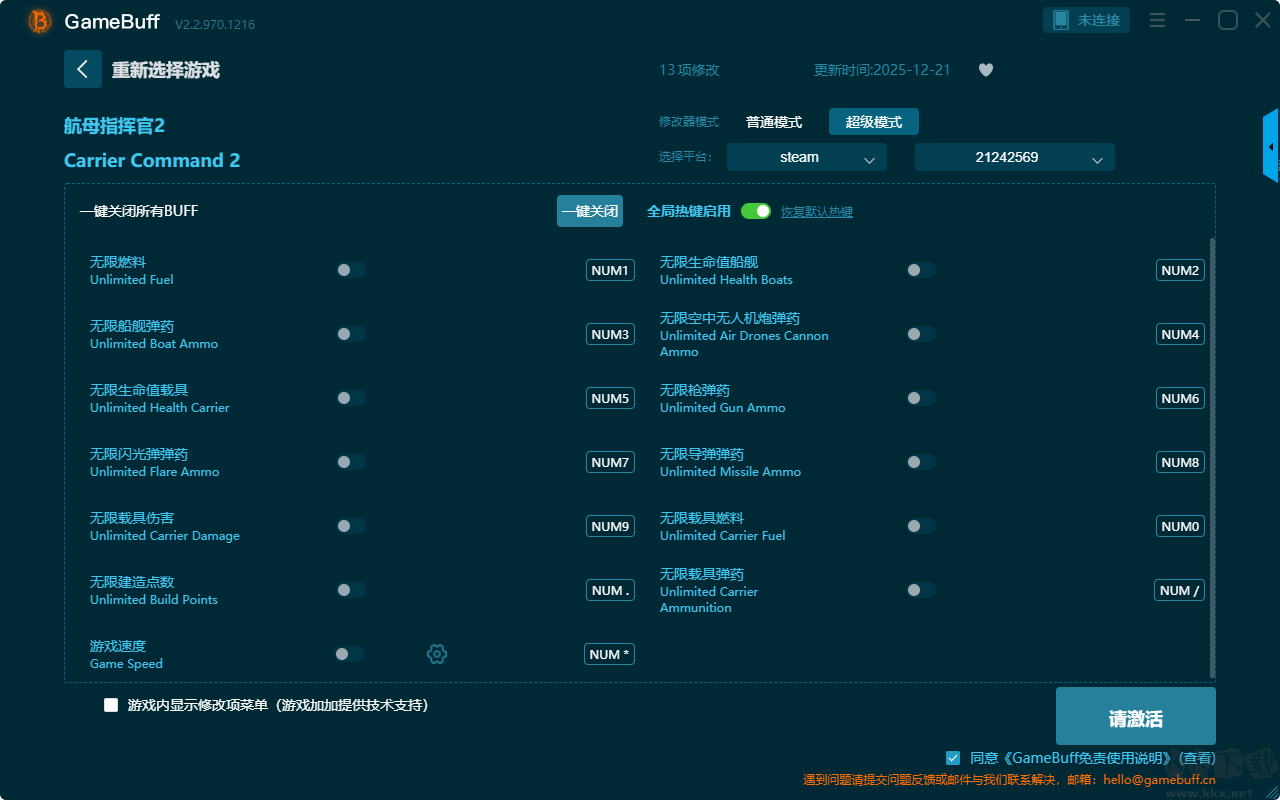 航母指挥官2十项修改器pc官方版是一款功能强大的游戏辅助功能,支持在steam平台使用。你可以在这款修改器中为游戏航母指挥官2一键开启,无限地面车辆生命、无限地面车辆弹药、无限航母导弹、无限航母喇叭 / 障、无限航母弹药、无限航母生命、无限燃料等超多项的修改功能。喜欢这款修改器的小伙伴快来KK下载站下载体验吧。