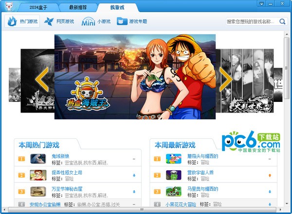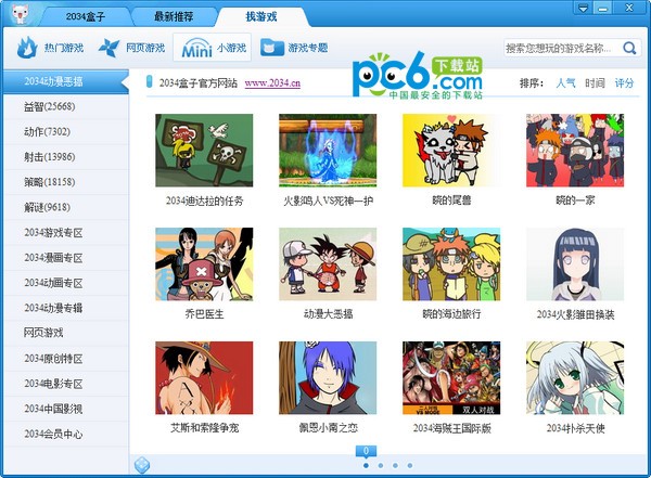 2034游戏盒子是2034小游戏官方制作的游戏盒子软件,2034盒子内收录了所有的2034原创海贼王,火影忍者,死神,妖精的尾巴等等动漫游戏类作品,每天都会更新最新的2034原创动漫作品。并且还有各类最新最全最好玩的小游戏。2034游戏盒子完全无病毒无插件,是国内动漫爱好者必备的软件!