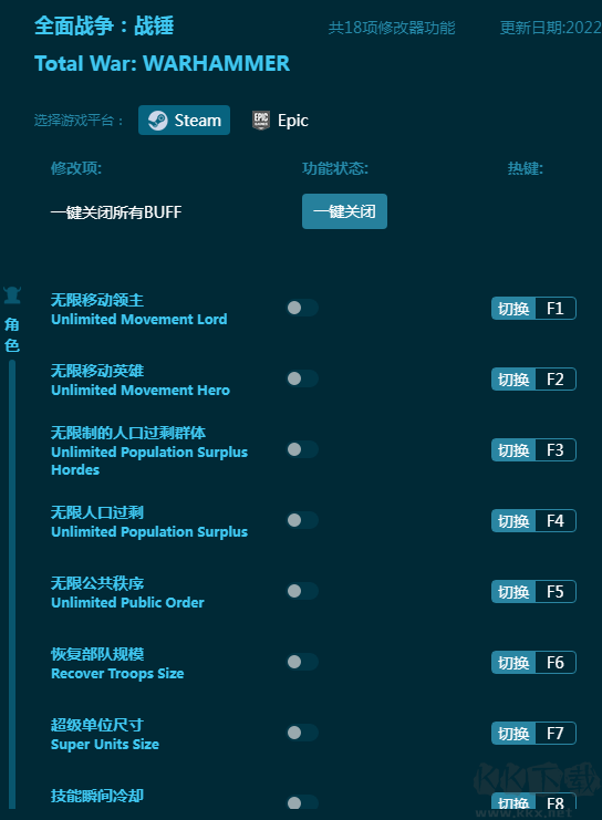 全面战争战锤修改器为广大《全面战争战锤》玩家提供十八项强力游戏修改功能。支持无限移动,无限人口,无CD等强力功能,一键使用轻松简单!感兴趣的朋友不要错过,KK下载站推荐大家下载体验!