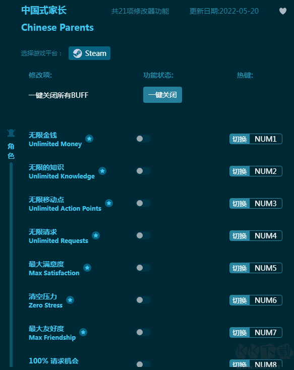 中国式家长修改器是一款全能游戏修改器软件,专为《中国式家长》游戏开发,为玩家提供二十一项游戏修改功能,每一项都能改变游戏走向。有了这款修改器,一定能让你培养出一个完美的人生!感兴趣的朋友不要错过,KK下载站推荐大家下载体验!