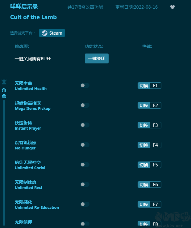 《咩咩启示录》是最近非常热门的Rougelike游戏。游戏有一定难度以及资源缺失的问题。KK小编为大家带来咩咩启示录修改器,内置十七项强力辅助功能,帮助玩家获得资源,生命,祈祷,信徒等等,有需要的朋友不要错过,KK下载站推荐大家下载体验!