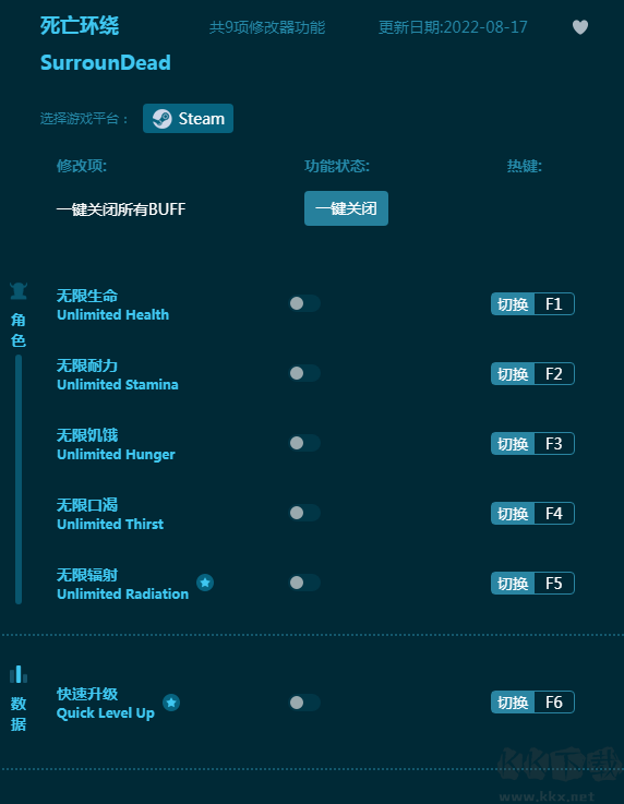 死亡环绕修改器是一款专业简单好用的游戏修改器软件,专为《死亡环绕》游戏开发。内置九项游戏辅助功能,包括无限生命,无限耐力,无限饥饿,无限口渴等等,帮助玩家轻松通关!感兴趣的朋友不要错过,KK下载站推荐大家下载体验!