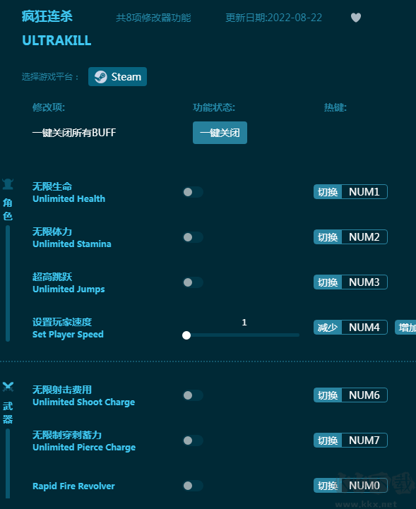 疯狂连杀修改器是一款专为新游戏《疯狂连杀》出品的辅助工具。内置八项强力辅助功能,玩家可自由开启关闭,包括无限生命,无限体力,超高跳跃,玩家速度等等,为玩家带来更畅快的游戏体验!有需要的朋友不要错过,KK下载站推荐大家下载体验!