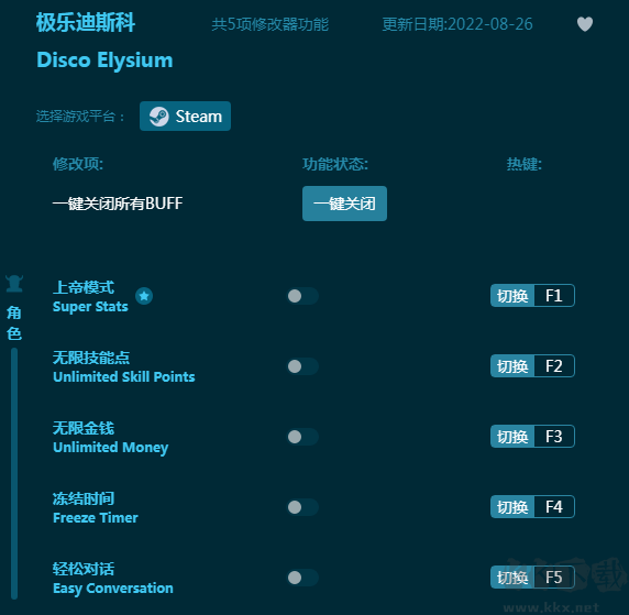 极乐迪斯科修改器是一款专为《极乐迪斯科》游戏打造的修改器软件。内置五项修改功能,包括上帝模式,无限技能点,无限金钱,冻结时间,轻松对话等强力功能,能够帮助玩家更轻松的完成游戏,体验游戏内容!有需要的朋友不要错过,KK下载站推荐大家下载体验!
