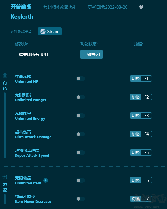 《开普勒斯》是一款超级好玩的沙盒rougelike游戏,今天KK小编为大家带来《开普勒斯》游戏的十四项修改辅助工具。十四项辅助功能包括无限生命,无限能量,无限饥饿,超级伤害等等,为玩家带来更爽快的游戏体验!有需要的朋友不要错过,KK下载站推荐大家下载体验!