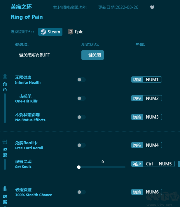 苦痛之环是一款难度较大的rougelike卡牌类游戏。kk小编就为大家带来这款通用版的《苦痛之环修改器》,支持多平台使用,十四项辅助功能:无限健康,一击必杀,不受状态影响,必定躲避等等,随时可开启,让玩家轻松通关!有需要的朋友不要错过,KK下载站推荐大家下载体验!