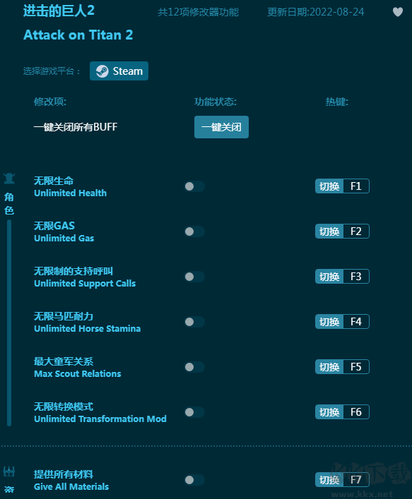进击的巨人2修改器是最新出品的《进击的巨人2》游戏辅助修改软件。带来十二项最新辅助功能,包括无限生命,无限GAS,无限呼叫,无限马匹耐力,无限转换模式等等,带给玩家最大游戏帮助,让玩家游戏体验更佳!有需要的朋友不要错过,KK下载站推荐大家下载体验!
