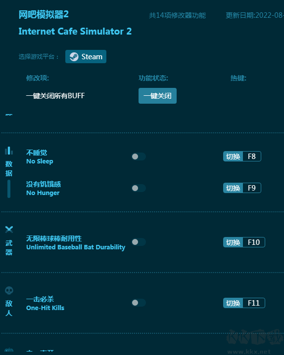 网吧模拟器2修改器专为《网吧模拟器2》游戏玩家打造,内置十四项游戏辅助,包括没有警察调查,一击必杀,没有盗窃,无限能量,无限棒球耐用度等等。有了这款修改器,让玩家无惧街头混混,警察,小偷等等,轻松经营网吧,把网吧做大做强!感兴趣的朋友不要错过,KK下载站推荐大家下载体验!