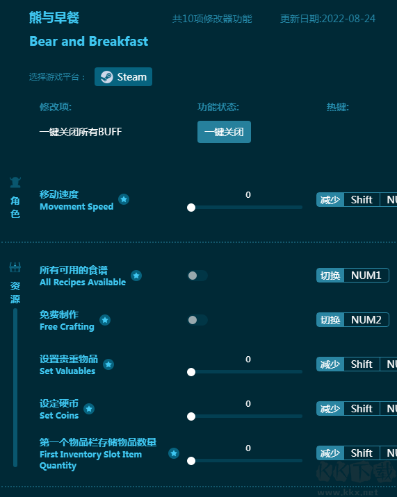 《熊与早餐》是一款轻松悠闲的动森模拟经营冒险游戏。而有了这款《熊与早餐修改器》,就能够帮助玩家获得游戏帮助,包括移动速度,食谱,免费制作,硬币,贵重物品等等,让玩家体验轻松的森林小镇生活!感兴趣的朋友不要错过,KK下载站推荐大家下载体验!