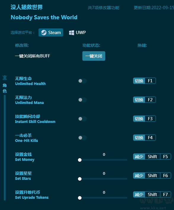没人拯救世界修改器是一款专为《没人拯救世界》游戏开发的多工游戏辅助工具。内置七项游戏辅助,包括无限生命,无限发力,一击必杀,设置金钱等等,帮助玩家拯救世界,游戏玩得更爽!感兴趣的朋友不要错过,KK下载站推荐大家下载体验!