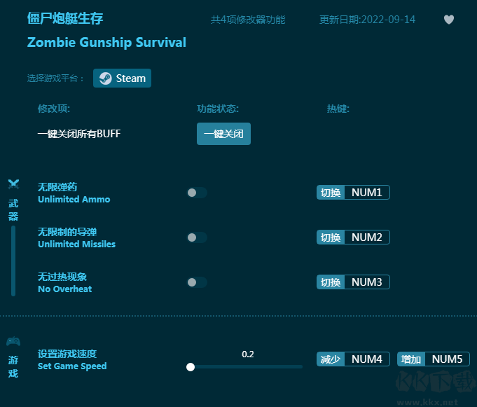 《僵尸炮艇生存》是一款丧尸末日题材的射击飞行游戏。玩家需驾驶战斗机,攻击丧尸军团。而这款《僵尸炮艇生存修改器》能够为玩家带来无限弹药,无限导弹,无过热等强力辅助,让玩家一次炸个够,游戏体验爽上天!感兴趣的朋友不要错过,KK下载站推荐大家下载体验!