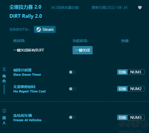 尘埃拉力赛2.0修改器是一款《尘埃拉力赛2.0》的专用游戏辅助工具。软件绿色安全,使用简单,进入游戏可随时开启辅助功能,包括减速计时器,无需维修时间等等,带给玩家最刺激的飙车体验,成为拉力赛之王!感兴趣的朋友不要错过,KK下载站推荐大家下载体验!
