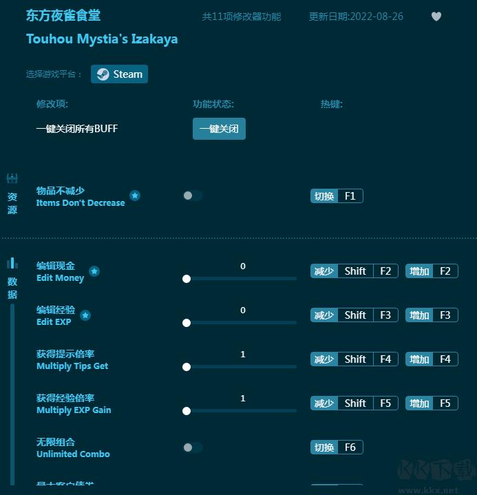 《东方夜雀食堂修改器》是针对东方夜雀食堂游戏出品的游戏辅助工具,内置十一项游戏辅助功能,对物品,现金,经验等均可进行修改。在游戏中玩家的梦想成为第一厨娘,东方夜雀食堂修改器帮助你实现梦想!感兴趣的朋友不要错过,KK下载站推荐大家下载体验!