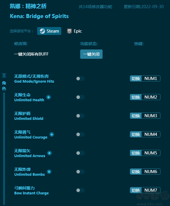 《凯娜精神之桥修改器》为玩家们带来全新的多功能十四项游戏辅助,包括无敌,无限生命,无限护盾,无限勇气,无限箭矢等等。功能强大,使用简单,能帮助玩家获得更爽的游戏体验!感兴趣的朋友不要错过,KK下载站推荐大家下载体验!