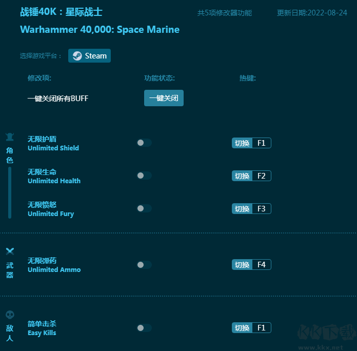 《战锤40k星际战士修改器》为玩家提供多功能游戏辅助,包括无限护盾,无限生命,无限愤怒等等,帮助玩家在游戏《战锤40k星际战士》中更轻松完成游戏任务,获得更佳的游戏体验!感兴趣的朋友不要错过,KK下载站推荐大家下载体验!
