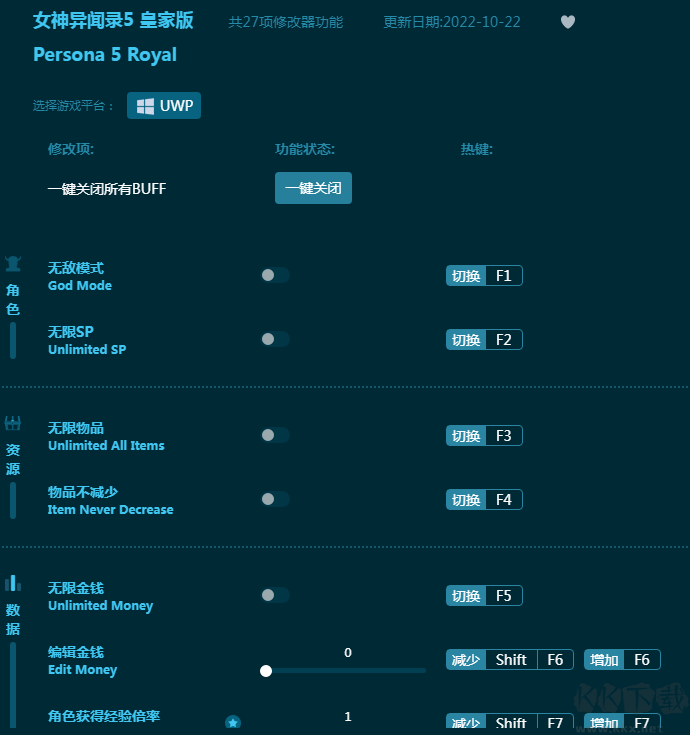 女神异闻录5皇家版修改器专为游戏《女神异闻录5皇家版》开发,为玩家提供全能二十七项游戏辅助功能,包括无敌,无限物品,无限金钱,无限SP等等,玩家可自由免费使用,一键开启轻松简单。让玩家获得更多更爽的游戏乐趣!感兴趣的朋友不要错过,KK下载站推荐大家下载体验!