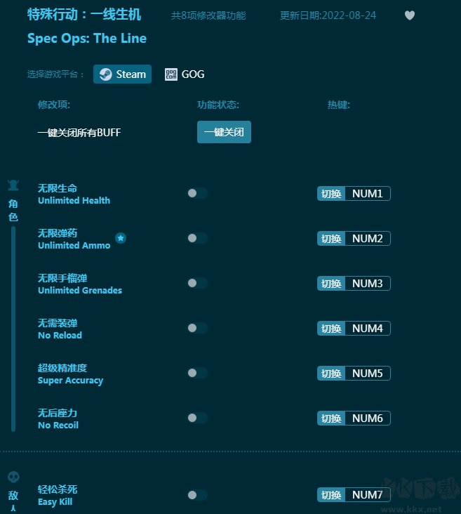 特殊行动:一线生机修改器是一款针对游戏《特殊行动:一线生机》打造的强力游戏辅助工具,共提供八项游戏辅助功能,包括无限生命,无限弹药,无限手榴弹,无后坐力,超级精准度等等功能,帮助玩家轻松完成特殊行动任务!感兴趣的朋友不要错过,KK下载站推荐大家下载体验!