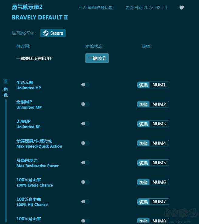 勇气默示录2修改器是一款针对《勇气默示录2》游戏打造的多功能游戏辅助工具,内置二十二游戏辅助,生命无限,无限MP,最高速度,最高恢复力等等众多强力功能都能自由开启,为玩家提供强力帮助,让游戏体验更佳!感兴趣的朋友不要错过,KK下载站推荐大家下载体验!