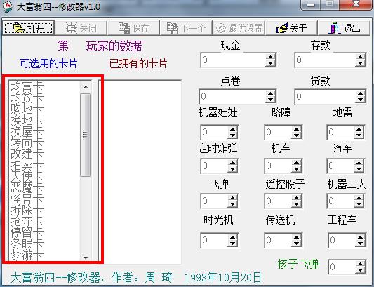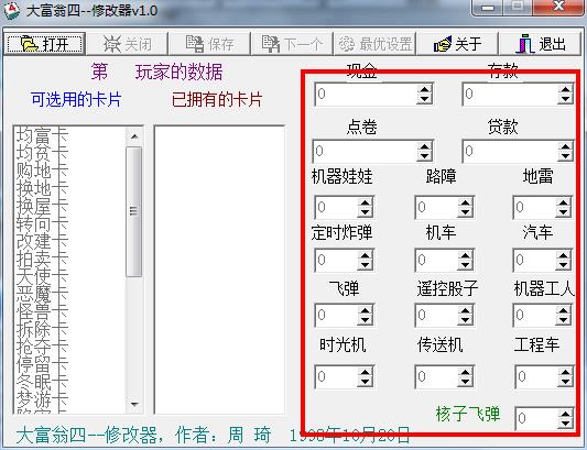 大富翁4游戏修改器是一款支持大《富翁4》这款游戏的修改器,主要支持修改现金、存款、点券和贷款的金额,而且自定义机器娃娃、路障、地雷、定时炸弹、机车、汽车、飞弹、遥控股子、机器工人、时光机、传送机和工程车等属性,功能真的是非常的强大,让你在游戏中轻松变成大富翁!