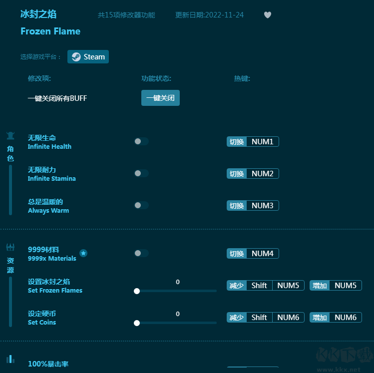 《冰封之焰》是一款自由冒险游戏,在这个崩坏的世界寻找神器,让世界回到原来的模样。KK下载站带来《冰封之焰修改器》提供十五项修改器,包括无限生命,无限耐力,总是温暖等帮助,让玩家的冒险更轻松,游戏体验更佳!感兴趣的朋友不要错过,KK下载站推荐大家下载体验!