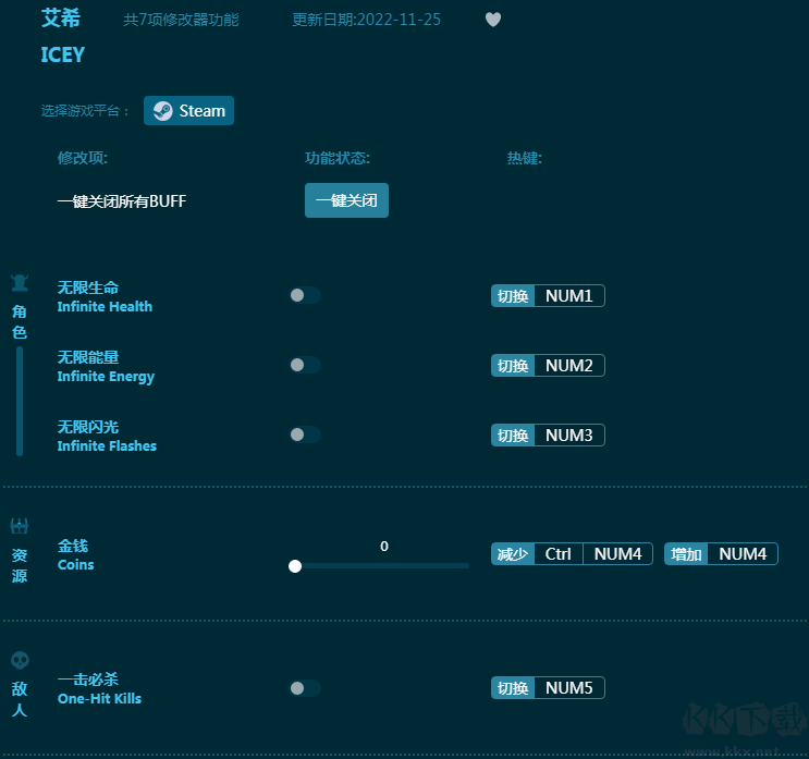 艾希修改器是一款专为针对游戏《艾希》出品的多功能游戏辅助。艾希修改器内置七项强力功能,帮助玩家拥有无限生命,无限能量,无限闪光,一击必杀等游戏帮助,让玩家的游戏体验更佳!感兴趣的朋友不要错过,KK下载站推荐大家下载体验!