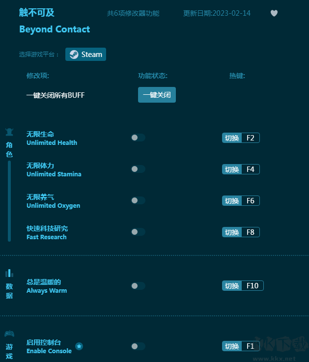 《触不可及》是一款全新的科幻生存游戏。浩瀚宇宙中的外星球上,你该如何生存。KK下载站带来这款《触不可及修改器》能够提供玩家无限生命,无限体力,无限氧气,快速研究科技等强力游戏辅助,帮助玩家生存,还能拯救外星球,游戏体验更佳!感兴趣的朋友不要错过,KK下载站推荐大家下载体验!