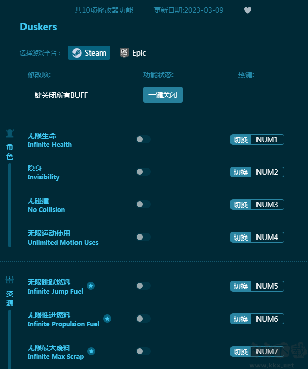 《Duskers》是一款宇宙探索游戏,宇宙变成了墓地,而你要努力生存下去。这款《Duskers修改器》为玩家提供无限生命,隐身,无碰撞,无限跳跃燃料,无限推进燃料,无限最大废料等等辅助,帮助玩家生存并找到宇宙的秘密!感兴趣的朋友不要错过,KK下载站推荐大家下载体验!