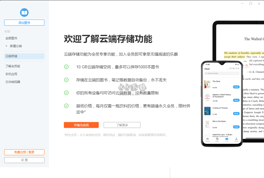 在云端存储文件、笔记、进度、设置,以及所有你能想到的一切!永远不用担心数据丢失,只需打开浏览器,轻轻一点,继续享受阅读