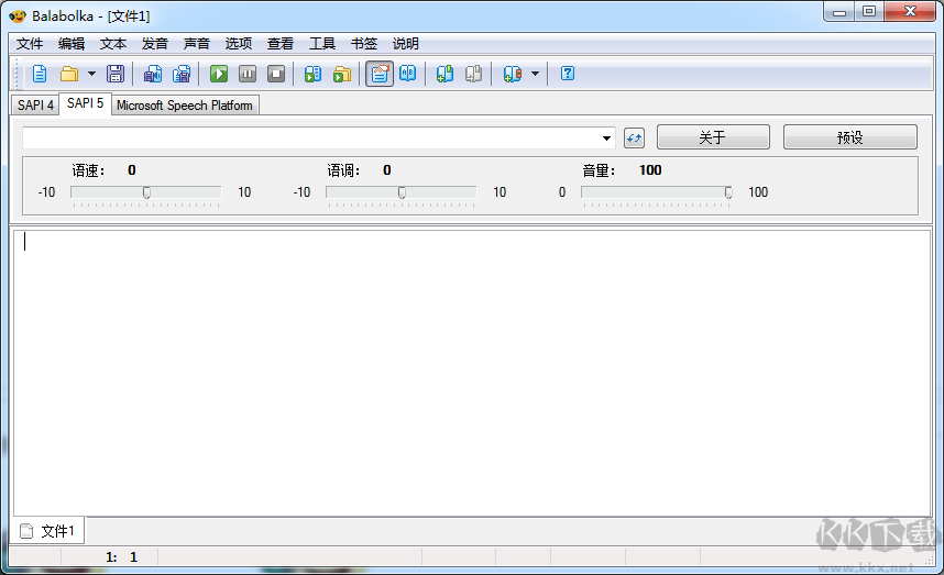 Balabolka电脑版是一款非常好用的,用户可以在这里将屏幕上的文字保存为一个WAV,MP3播放,OGG或者WMA文件,并且用户还能根据自己的需求自定义文本的字体和背景颜色,还能快速改变语音的参数,极大的提高语音的清晰度,感兴趣或者有需要的小伙伴就快来kk网站下载体验一下吧。