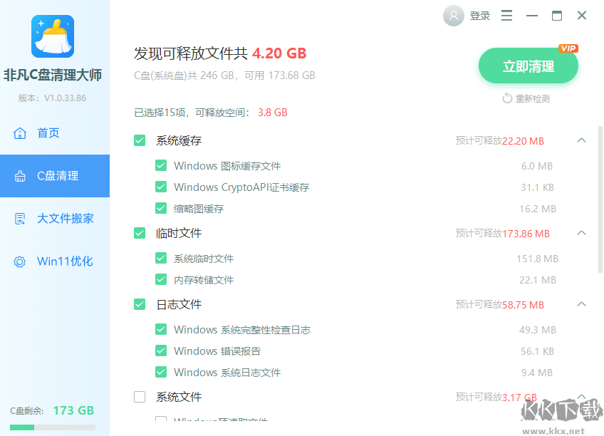非凡C盘清理大师电脑版是一款非常专业的,可以帮助用户清理磁盘垃圾的软件,用户能够通过这款软件快速扫描清理系统中不需要的文件和清理残留下的文件,还能快速智能的为你识别C盘中一些体积大的容量文件,能够有效的为你解决因C盘储存空间不足导致卡顿的问题,感兴趣或者有需要的小伙伴就快来kk网站下载体验一下吧。