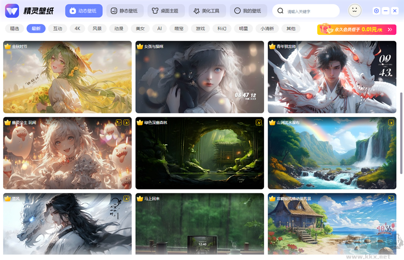 精灵动态壁纸电脑版是一款为用户提供海量丰富动态壁纸和静态壁纸的高清壁纸软件,这款软件能够支持用户在PC端和移动端进行使用,让你的桌面变得更加的酷炫,海量超清4K壁纸涵盖了各种类型和风格,如二次元,风景,美女,萌宠,游戏等,满足不同用户的口味需求,感兴趣或者有需要的小伙伴就快来kk网站下载体验一下吧。