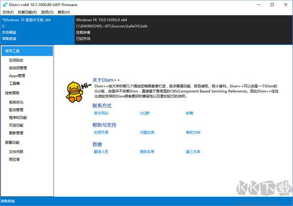 Dism++(系统精简优化工具);一款非常实用的系统优化精简工具,t它具有体积小,功能强大的特点,它可以精简Windows系统中需要的组件、自带应用,此外,该软件还可以清理电脑系统的垃圾,为用户电脑释放空间,有需要的朋友可以来kk网站下方下载试试。