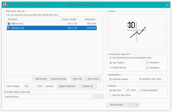 将集合个人档案到 Animated PNG 图像文件。它给你的选项,以改变帧拖动和阶滴,看到帧处理(不管或不在之前的两个保持架上背景),循环计数,跳过第一帧和各种压缩方法的选择从。