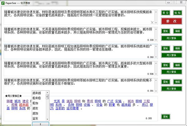 很多在撰写论文中没有思路,这是写不好论文的最大原因,而这个助手对于每一个需要修改的句子,可以提供四个句子修改选项,方便用户根据自己的需要进行选择。