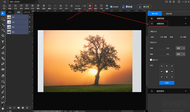 1、修改画布大小:选择“画布”,打开“调整画布”对话框。在该对话框中,用户可以对画布的宽度、高度、定位进行调整。