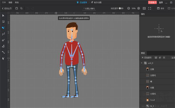 6、骨骼运动定制:添加骨骼后可操控角色移动、旋转,曲线骨骼让动画效果更圆润 。