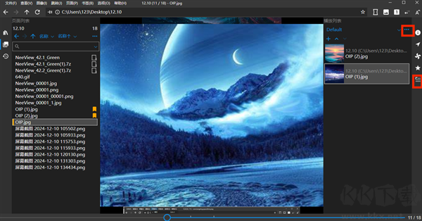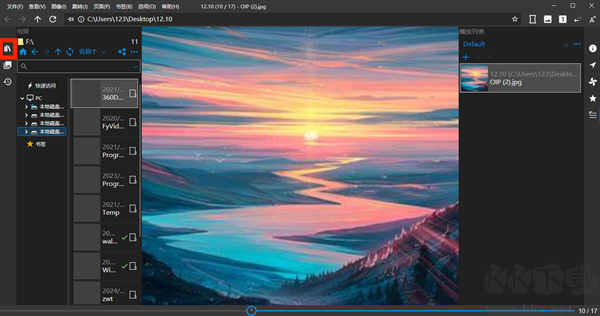 有趣的是当我们打开一个文件夹,点击顶部地址栏右边的 “左右” 图标,它底部的进度条滑动快可以像书本一样选择 “左开” 或 “右开”,左右拖动进度条或者鼠标单击和双击,分别对应上一张图片和下一张图片,而顶部地址栏右边的数字按钮表示的是 1 页面显示和 2 页面显示,说白了就是 A4 纸和 A3 纸的区别。