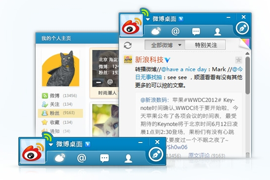 新浪微博桌面是新浪为旗下的微博用户朋友们打造的一款适用于计算机中使用的基本将Web版微博的功能全部搬到桌面上并进行了优化后的桌面版新浪微博客户端。这款微博桌面除了可以查看微博之外还支持IM即时通信功能,支持在线终端显示,好友列表分组浏览。新浪微博桌面客户端采用C++开发,速度流畅,不怎么占用空间,是一款适用于Windows操作系统的微博客户端,欢迎有需要的用户前来获取!