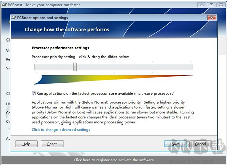 PcBoost(系统优化工具)是一款强大的计算机系统优化的工具,可以充分调动CPU全部性能,全面支撑当前运行的软件。操作十分简单,拖动鼠标进度条就可以完成优化,还能根据个人使用习惯和不同需求,比如玩游戏、浏览网站、文字处理等,调整对应参数设定,帮助电脑发挥最大性能。软件的功能非常的强大,需要的朋友快来下载试试吧!