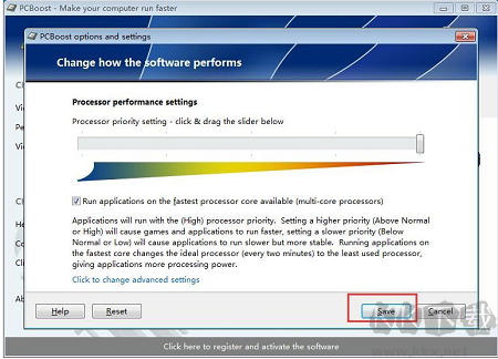 将滑块向右滑到地,就可以保持CPU以非常高性能运行,随时可以应对同时处理多任务的情况。点击[Save]就可以保存设置并返回PGWARE PCBoost主界面。