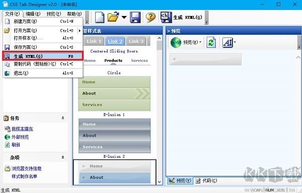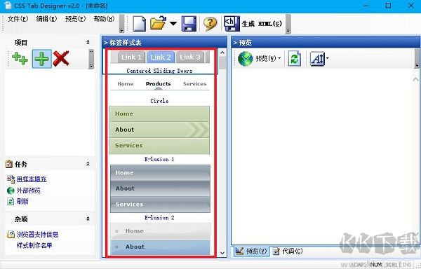 3、帮助你快速高效地完成导航列表或标签栏的设计工作,用户可自由切换超过60种不同的风格与色彩组合,所有操作直观简便,同时系统自动生成结构清晰、语义规范的XHTML代码,让你无需编写一行代码,也能轻松打造出专业级的网页标签组件。