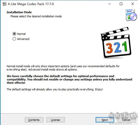 2、K-Lite Mega Codec Pack提供了2种安装模式供用户使用,从上到下为一般模式(Normal)、高级模式(Advanced)根据选择的模式,安装的内容会有较大的区别,越是高等级的模式安装的内容就越多,普通用户选择一般或是高级模式就能几乎满足所有的需要。