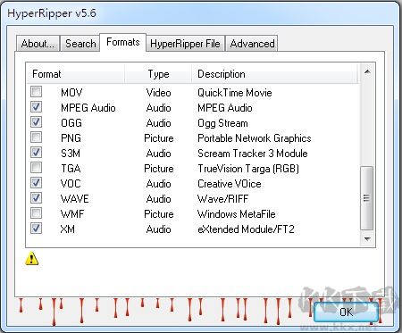 2、在弹出的窗口中,切换至“Format”选项卡,勾选需提取的文件类型,如 Wave、OGG 等(Dragon UnPACKer 也支持提取 AVI 等其他格式文件)。
