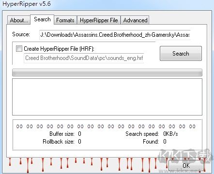 4、然后切换到search选项卡,在source一栏中,点右边那个省略号按钮,选择你要解包的pck文件,这里我们选另外一个文件试试,就那个sounds_eng.pck,用来提取E叔的声音,完成后,点击search,就又开始刷刷刷的扫描了